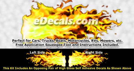 These custom designed realistic flame decals are available as mirrored pairs only. They can be installed on any smooth surface including cars, trucks, boats, motorcycles, helmets, skateboards, etc. Sizes shown are approximate. Measure your vehicle before ordering. Flame designs are shown on a colored background. Actual decal may have a slight black border and color may differ slightly from the image shown.